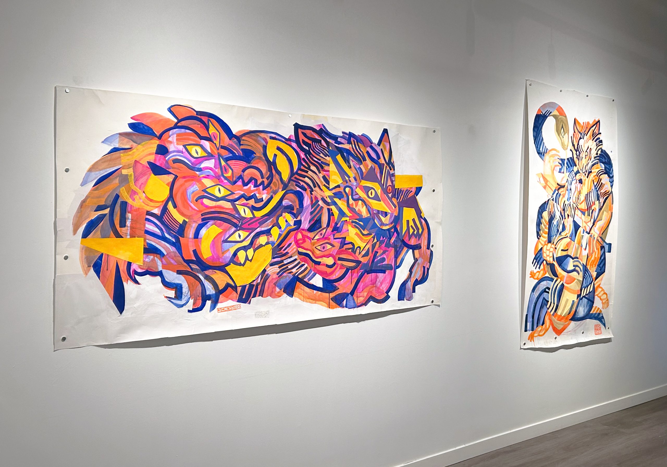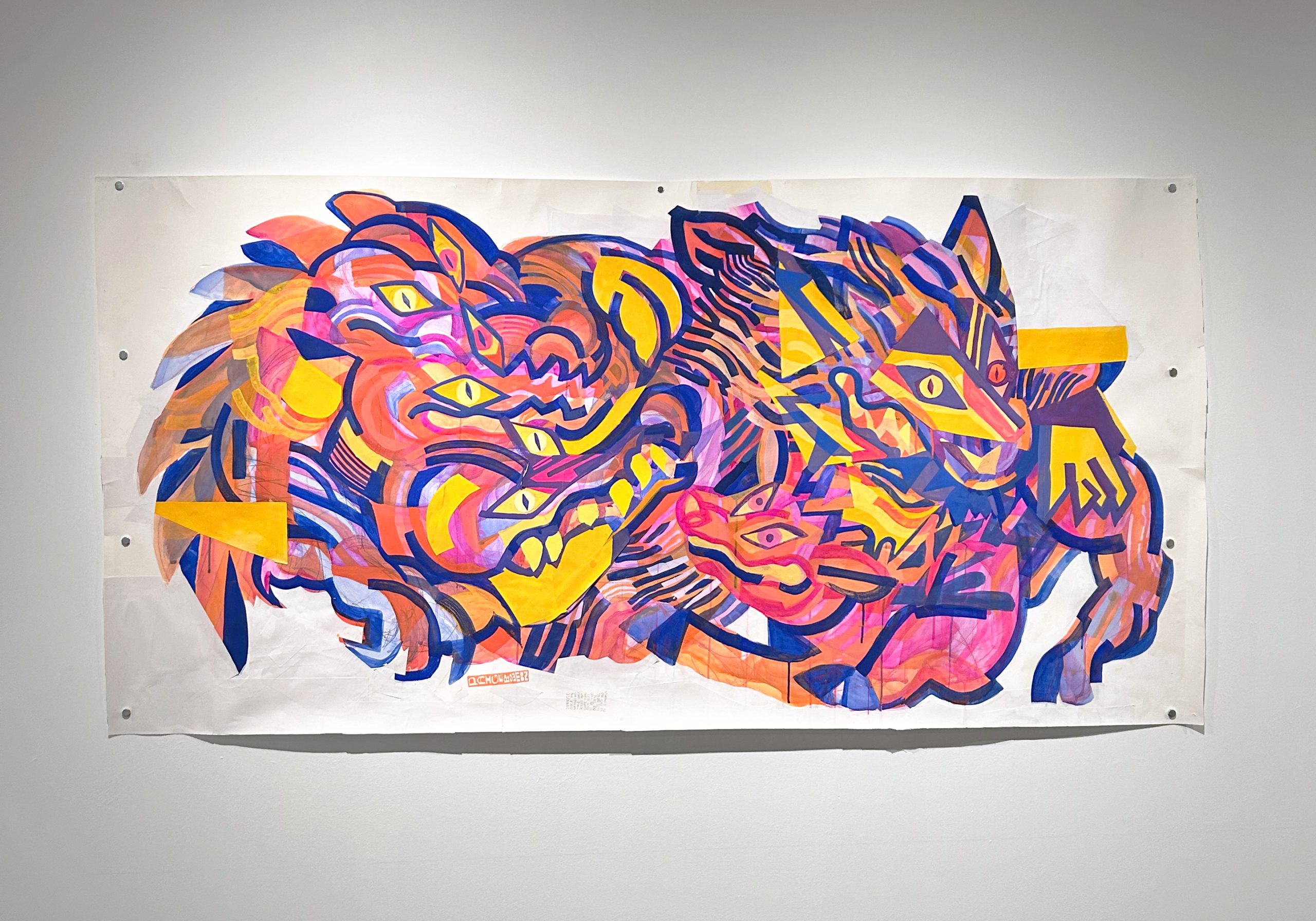Paige Bowman (they/them) is a nonbinary settler born and raised on the unceded territory of the LEKWUNGEN and WSANEC peoples (“Victoria”) and currently residing in the unceded territory of the Musqueam, Squamish and Tsleil-Waututh peoples (“Vancouver”). They are a working illustrator who uses predominantly traditional materials within the context of painting, animation, mural, and sculpture. Their work is inspired by folklore, storytelling, identity and connection to our natural world. Bright palettes and bold shapes make up the bulk of their practice, as well as embracing accidental mark making and the unpredictable nature of damaged materials and surfaces.